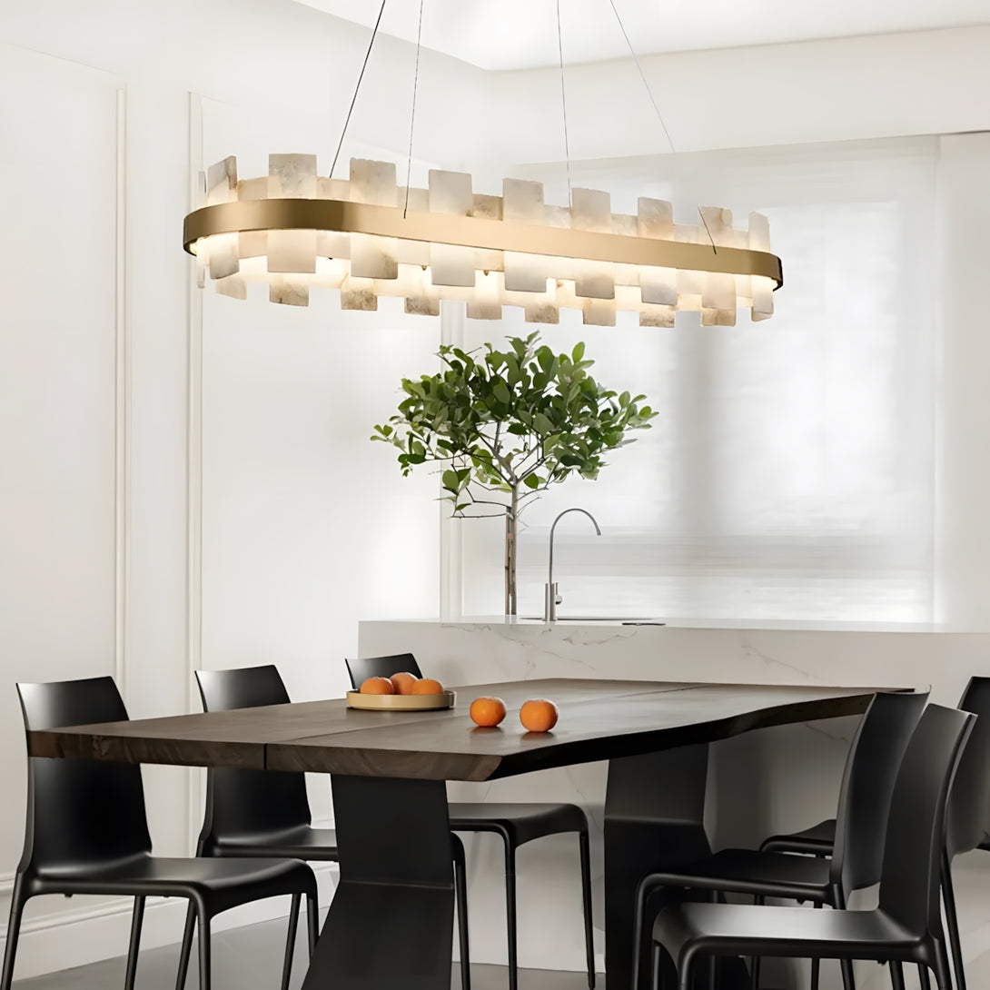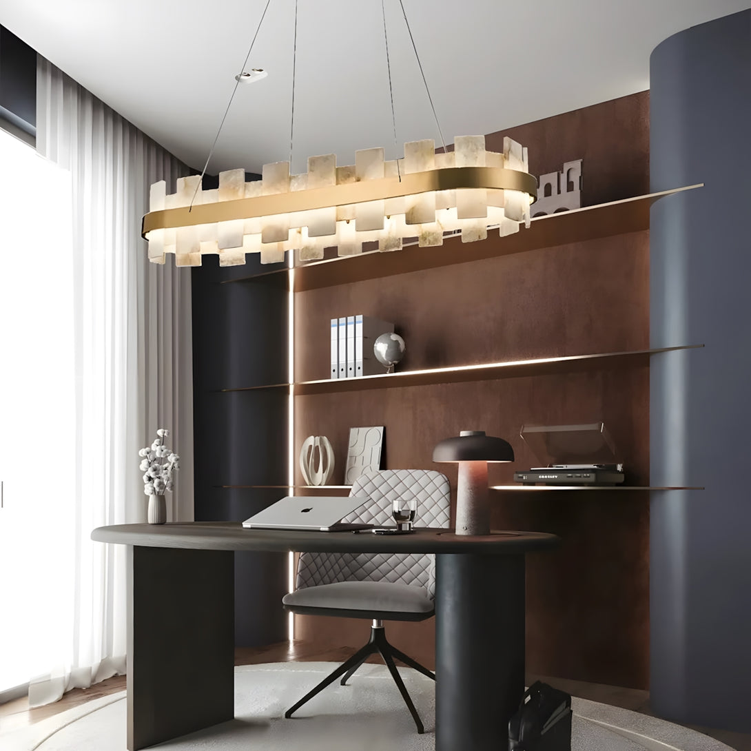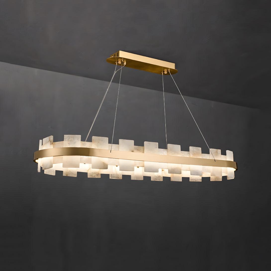 Bring refined charm to your home with the Omvilo Chandelier. Crafted from natural alabaster and warm copper, this elegant fixture radiates sophistication. The herringbone pattern with soft white swirls glows beautifully, creating a serene atmosphere in your living room, dining space, or hallway.